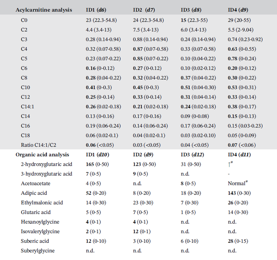 采集外周血样本进行串联质谱复查,结果显示4例新生儿的C14:1指标均超出参考值范围;同时发现C4、C5、C6、C8、C10、C12和C14等指标也出现异常,这又与MADD的乙酰肉碱谱一致。ID1,ID2和ID4尿有机酸检测结果也高度符合MADD特征,详见下图。