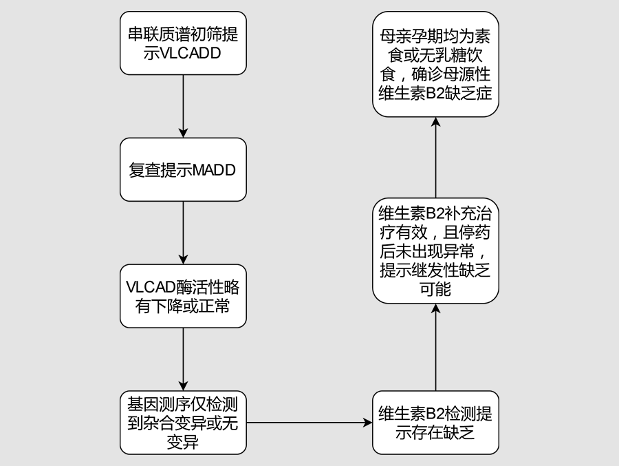 近日,发表在《JMID Reports》杂志,题为“Abnormal VLCADD newborn screening resembling MADD in four neonates with decreased riboflavin levels and VLCAD activity”的研究,报道了4例串联质谱初筛结果提示为极长链酰基辅酶A脱氢酶缺乏症(VLCADD)、复查结果又提示为多种酰基辅酶A脱氢酶缺乏症(戊二酸血症II型,MADD)、但最终确诊为母源性维生素B2缺乏症的新生儿。