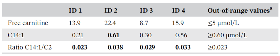 4例新生儿均为健康、足月出生,在充分母乳喂养后采集足跟血样本进行遗传代谢病串联质谱筛查。如下图所示,1例新生儿(ID1)C14:1和C14:1/C2指标异常,3例(ID1,ID3和ID4)仅C14:1/C2指标异常,提示极长链酰基辅酶A缺乏症(VLCADD)可能。