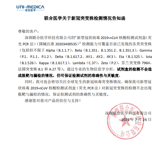 同时,我司也会密切关注全球发生的新冠病毒突变株情况,确保我司新型冠状病毒2019-nCoV核酸检测试剂盒(荧光PCR法)对新冠突变株的检测不会出现脱靶与漏检的情况,保证检测试剂的准确性与灵敏度,助力新冠疫情的全球防控。