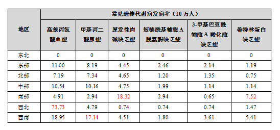 下表所示为不同地区六种高发遗传代谢病(>1/100000)的发病率数据:高苯丙氨酸血症在西北地区的发病率排在首位,高达73.73/100000(1/1356);甲基丙二酸尿症在西南地区发病率最高,为17.14/100000(1/5834);原发性肉碱缺乏症和希特林蛋白缺乏症均在南部地区发病率最高,分别为18.32/100000(1/5459)和7.52/100000(1/13298)。六种高发遗传代谢病在东北地区的6万多新生儿中均未检出。