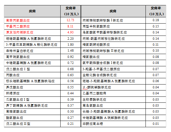 氨基酸代谢病发病率,17.14/100000(1/5834);