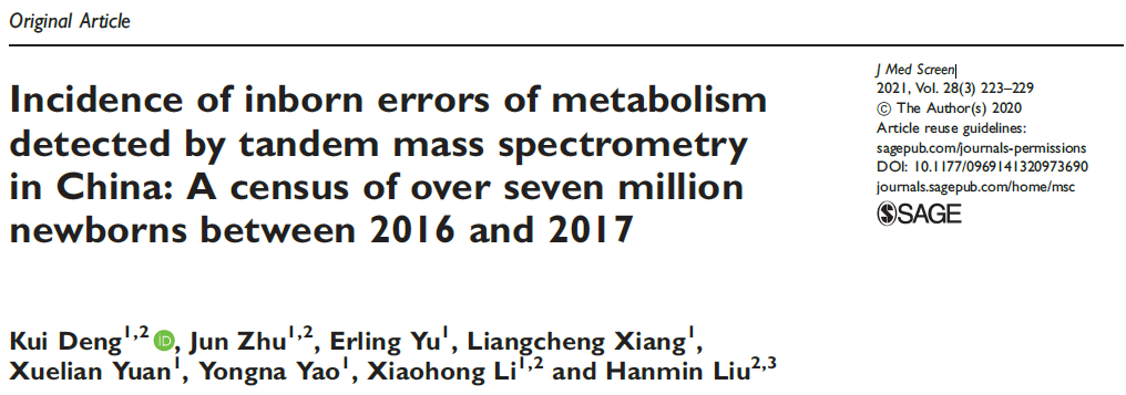 近日,发表在《Journal of medical screening》杂志,题为“Incidence of inborn errors of metabolism detected by tandem mass spectrometry in China: A census of over seven million newborns between 2016 and 2017”的研究,首次从整体层面上报道了我国2016年至2017年间新生儿遗传代谢病串联质谱筛查的结果。
