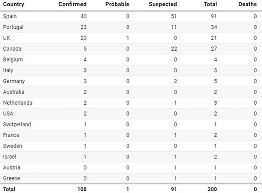 截至5月22日,世卫组织收到了包括英国、西班牙、葡萄牙、德国、意大利、美国、加拿大、澳大利亚、以色列等14个国家报告的108例确诊病例和91例疑似病例。