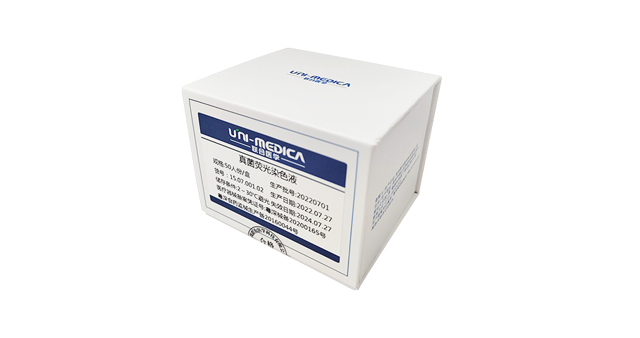 本染色液为多种免疫荧光染料的混合液,可在同样的染色条件下,同时对上皮细胞、白细胞、乳杆菌、加德纳菌、真菌、阴道毛滴虫进行免疫荧光标记染色,使其各自在同一光源下呈现不同的染色效果,最终实现在同一光源、同一视野下易于区分的目的。